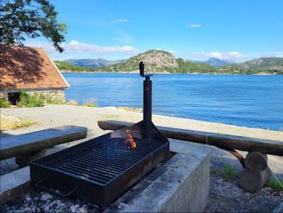 Eine Seite offen, dort mit Blick auf das Fjord und Lagerfeuer möglichkeit. Das übernachten ist frei und eine Toilette und Dusche. Von der Komune zur Verfügung gestellt.